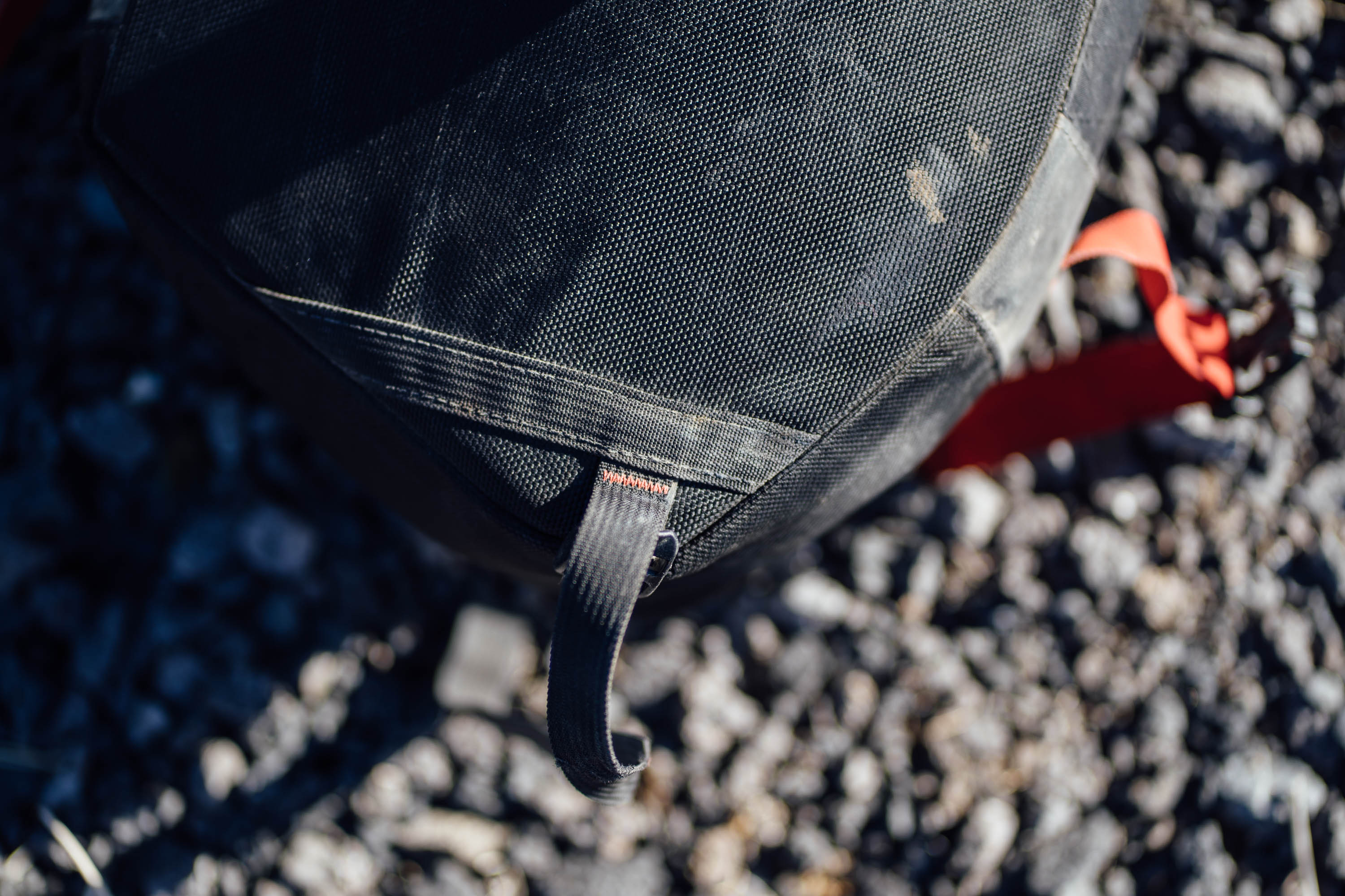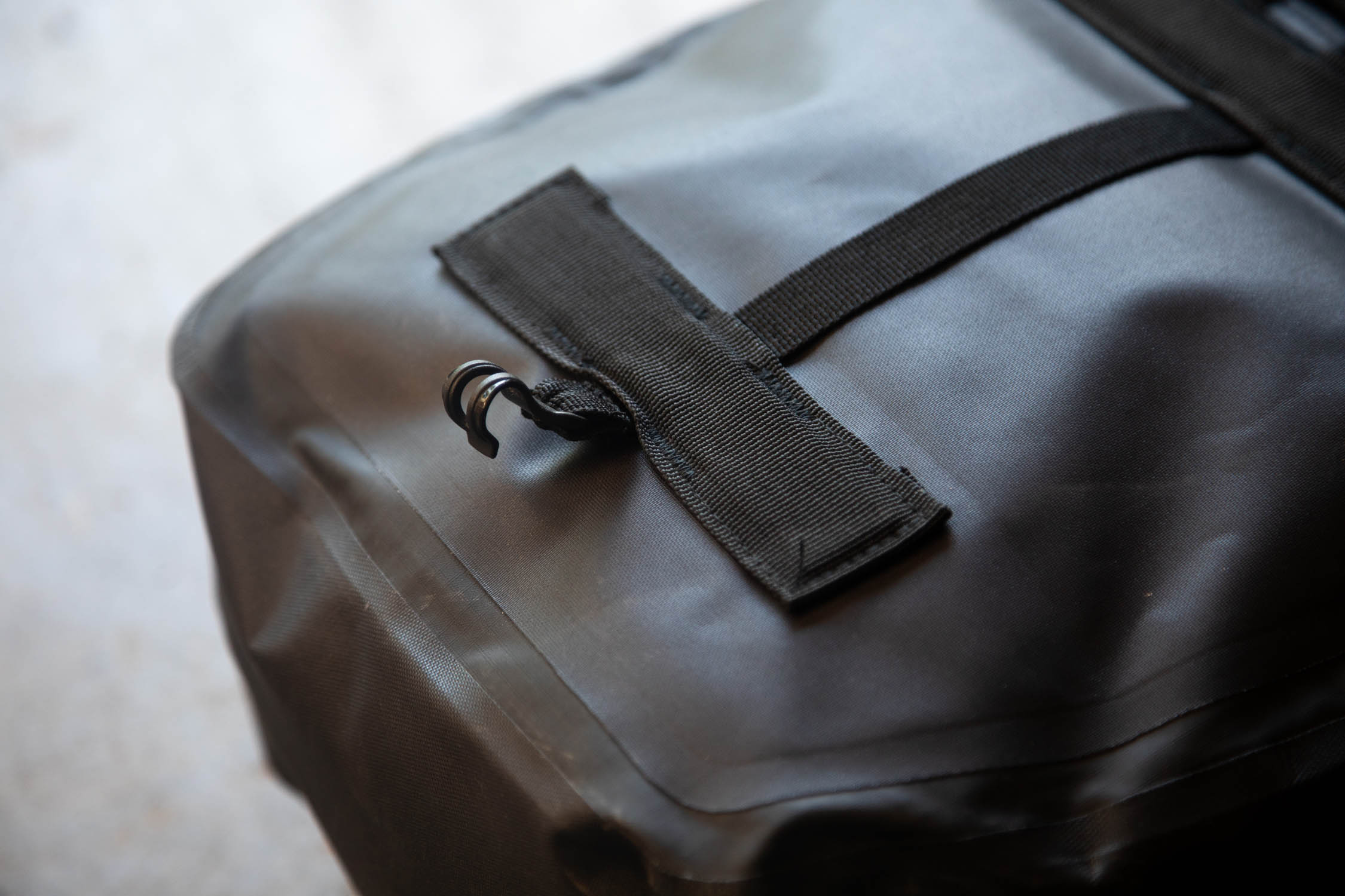There are two attachment points along the upper stiffener where two Voile Nano Straps secure the pannier to your rack and a vertical length of daisy chain along the back of the pannier provides an attachment point for a third strap. The exterior of the bag is made from a hard-wearing 1000-denier Cordura, the interior is lined with 420-denier ripstop nylon, and the bag is finished with Roadrunner’s proprietary seam taping, giving it a high level of waterproofness. Aside from the main compartment, there is a smaller velcro pocket on the front for quick-access items.