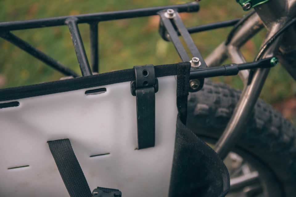 Officially, the Hermosas are designed for Salsa and Surly racks, but I mounted mine to a more minimal Tubus Vega without any issues. And, although they’re not made with front-loading in mind, I’ve also fitted them to a Surly 8 Pack front rack, running the lower strap beneath a fork-mounted water bottle cage. The spacing for the velcro straps isn’t perfect, but it works. Again, whilst the Hermosas are not designed to be used with low riders, they mount up nicely to a set of Tubus Duos. Worth noting though – for those who plan to run them this way – is that that there are no velcro strap “tidies” and the lower attachment straps dangles down, so you’ll just have to tuck them in.